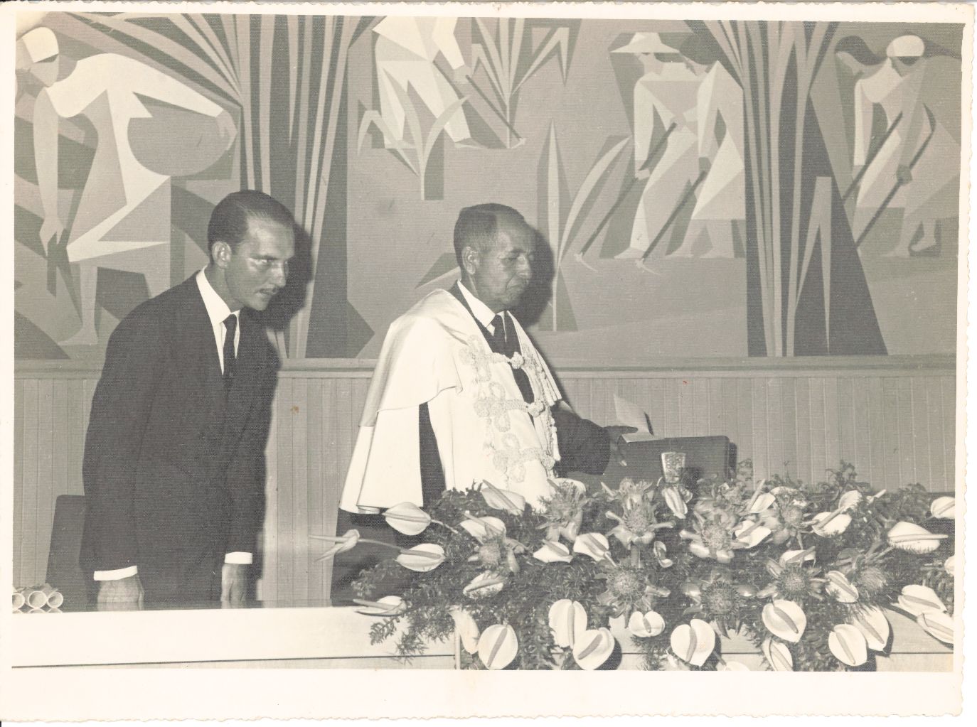 Título: | Reitor Renato Ramos acompanhado pelo Ministro da Agricultura, Armando Monteiro durante a solenidade de formatura da turma de engenheiros agrônomos de 1962 |