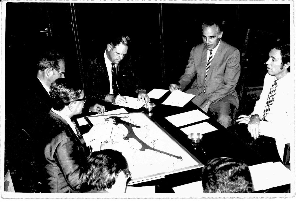 Abstract: Fotografia que captou a continuação da reunião registrada também na fotografia 14, vendo-se o reitor Adierson diante dos professores Júlio Fernandes do Curso de Medicina Veterinária e do professor Evaldo Cisne Azevedo do Curso de Química, bem como de mais 04 autoridades em torno de uma mesa, sobre a qual encontram-se o mapa de Pernambuco com o gráfico do Projeto da Interiorização da UFRPE para Garanhuns e outros documentos. Nela, o fotografo conseguiu captar o instante exato da realidade em que houve o movimento de mãos da autoridade sentada à cabeceira da mesa que cruzou o braço esquerdo sobre o direito enquanto escrevia, bem como captou a mudança dos olhares e das posturas dos presentes. Durante a entrevista para contextualização, o ex-reitor Adierson, não conseguiu lembrar os nomes dessas autoridades. FONTES DE PESQUISA: Entrevista concedida às bibliotecárias Conceição Martins e Vania Ferreira para atender aos objetivos do Repositório Institucional, projeto “(Re) Memórias da UFRPE”, para a contextualização das imagens do acervo fotográfico do reitorado do Prof. Dr. Adierson Erasmo de Azevedo, no período de dezembro de 1969 a agosto de 1973. Acervo localizado no Núcleo do Conhecimento Professor João Baptista Oliveira dos Santos , da Biblioteca Central da UFRPE. Entrevista realizada no dia 13 de abril de 2016, no Espaço Santander da Biblioteca Central da UFRPE. Duração de 2h40min com transcrição e pesquisa complementar da bibliotecária Conceição Martins. AZEVEDO, Adierson Erasmo de. A “Caminhada seguindo o Sol” da Universidade Federal Rural de Pernambuco. Recife: Editora UFRPE, 2007.