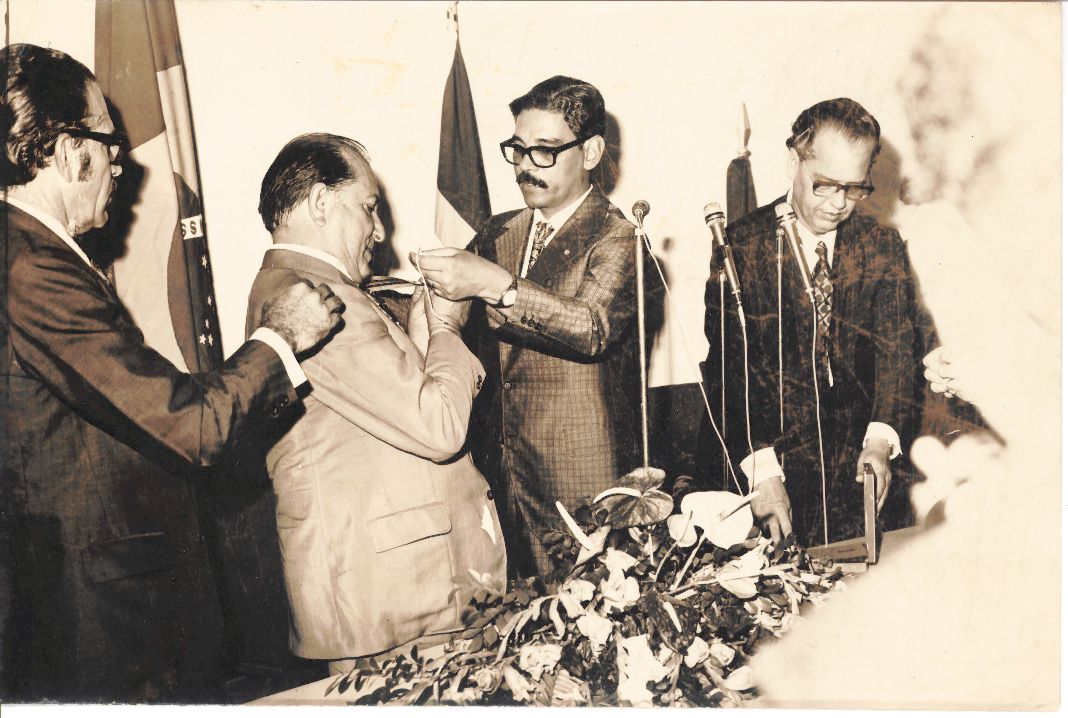 | Abstract: | Registra o professor Adierson Erasmo de Azevedo, reitor da UFRPE, durante a Solenidade de outorga da Comenda do Mérito Universitário da UFRPE ao Governador de Pernambuco, Eraldo Gueiros Leite. Como essa fotografia não possui uma data especificada, adotamos o ano de 1971 como a data em que foi registrada. Vê-se a mesa de honra da mencionada solenidade devidamente ornamentada, na qual encontram-se o reitor Adierson colocando a comenda no governador de Pernambuco, Eraldo Gueiros Leite, vê-se também ao do reitor, o professor Murilo Salgado, vice-reitor da UFRPE. Ao lado do governador, há um senhor não identificado. Na parede, encontram-se as bandeiras do Brasil, de Pernambuco e da UFRPE. Durante a entrevista para rememoração, ao observar a fotografia, o reitor Adierson falou: “Eraldo Gueiros era um amigão meu! ... Entrega de Comenda do Mérito Universitário da UFRPE ao Governador de Pernambuco, Dr. Eraldo Gueiros Leite... (lendo em conjunto com Conceição Martins! )... Tá bom (Observando...) Aqui estou colocando a comenda, ao meu lado está Murilo, meu vice-reitor... Não lembro quem é esse que aparece no lado esquerdo.... Não consigo lembrar o nome dele... Eita pau! Não lembro. (Observando)” FONTES DE PESQUISA: Entrevista concedida às bibliotecárias Conceição Martins e Vania Ferreira para atender aos objetivos do Repositório Institucional, projeto “(Re) Memórias da UFRPE”, para a contextualização das imagens do acervo fotográfico do reitorado do Prof. Dr. Adierson Erasmo de Azevedo, no período de dezembro de 1969 a agosto de 1973. Acervo localizado no Núcleo do Conhecimento e da Memória Agronômica “Professor João Baptista Oliveira dos Santos”, da Biblioteca Central da UFRPE. Entrevista realizada no dia 27 de abril de 2016, no Espaço Santander da Biblioteca Central da UFRPE. Duração de 2h17min com transcrição e pesquisa complementar da bibliotecária Conceição Martins. |