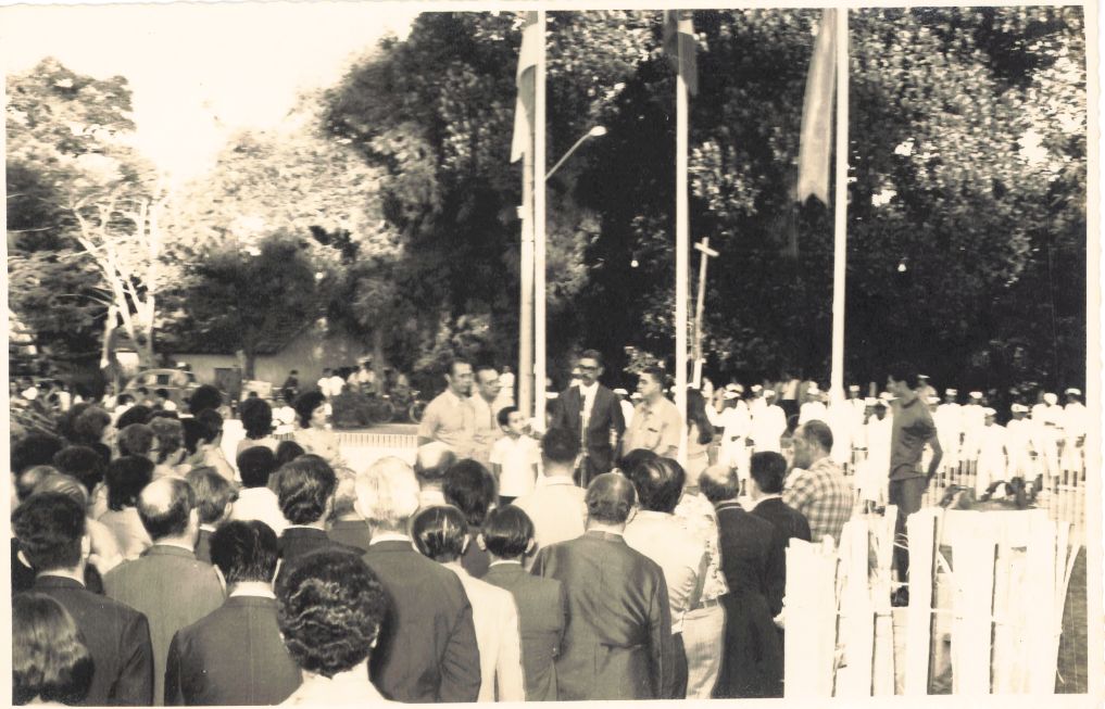 Abstract: | Registra a nona e última fotografia relativa à solenidade de inauguração da Escola Lions Recife Parnamirim, construída com recursos angariados pelo Lions Clube Recife Parnamirim Distrito L14, em terreno cedido pela Universidade Federal Rural de Pernambuco, ocorrida no dia 28 de agosto de 1971. Esta fotografia, retrata o momento em que o professor Adierson Erasmo de Azevedo, reitor da UFRPE, discursava após o hasteamento das bandeiras. Encontram-se ao seu lado o professor Waldecy Fernandes Pinto, docente da UFRPE e membro do Lions Clube Parnamirim, o Dr. Dr. Alfredo Vieira, presidente do Lions Clube de Parnamirim, além de outro professor de nomen não identificado. Vê-se também um garoto olhando o reitor Adierson. Observa-se no entorno grande quantidade de membros do Lions Clube Parnamirim, representantes da UFRPE, a banda dos Aprendizes de Marinheiros e pessoas da comunidade todos presentes no evento. Durante a entrevista para rememoração, ao observar a fotografia, o reitor Adierson falou: “É muito bom olhar para trás e ver minhas pegadas firmes e fortes ao longo da minha vida e os frutos que consegui deixar e estão registrados nessas fotografias... É muito gratificante rever o resultado do que semeei em meu reitorado aqui na UFRPE”. FONTES DE PESQUISA: Entrevista concedida às bibliotecárias Conceição Martins e Vania Ferreira para atender aos objetivos do Repositório Institucional, projeto “(Re) Memórias da UFRPE”, para a contextualização das imagens do acervo fotográfico do reitorado do Prof. Dr. Adierson Erasmo de Azevedo, no período de dezembro de 1969 a agosto de 1973. Acervo localizado no Núcleo do Conhecimento Professor João Baptista Oliveira dos Santos da Biblioteca Central, da Biblioteca Central da UFRPE. Entrevista realizada no dia 04 de maio de 2016, no setor de Normalização da Biblioteca Central da UFRPE. Duração de 2h32min22seg. com transcrição e pesquisa complementar da bibliotecária Conceição Martins. |