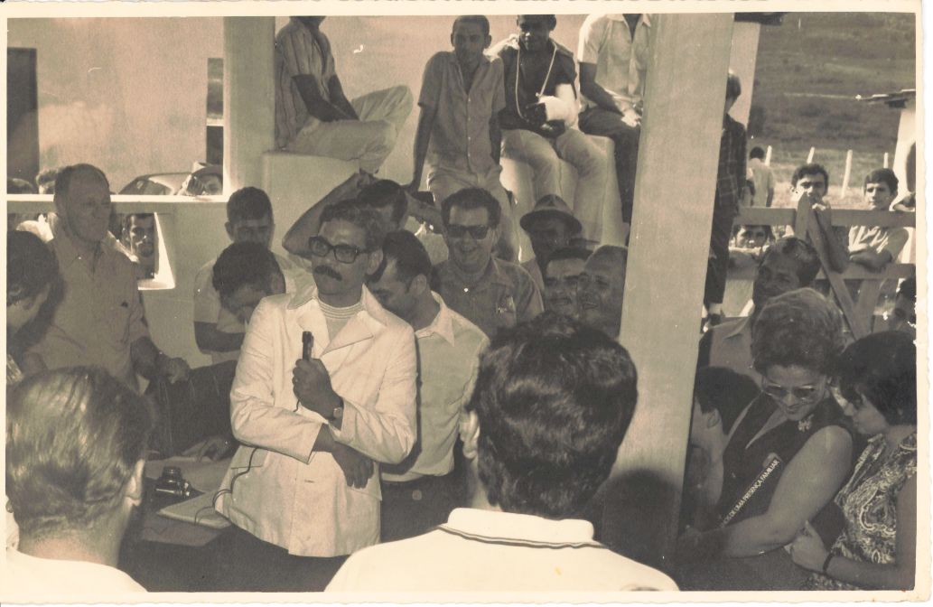 | Abstract: | Retrata o leilão de gado realizado na Fazenda Agropastoril da UFRPE localizada em São Bento, Tapera, no Município de São Lourenço da Mata, Pernambuco, em 30 de setembro de 1971. Nessa fotografia, vê-se o professor Adierson Erasmo de Azevedo, reitor da UFRPE, em traje esportivo, usando da palavra durante o leilão de gado e estava acompanhado por alguns professores da universidade. Observa-se a presença de muitas pessoas, entre elas, duas mulheres, ambas localizadas no ângulo inferior do lado direito da fotografia. Aquela que traja vestido escuro, possui um broche na gola esquerda, usa óculos, está com 01 livro sob o braço esquerdo cujo título é possível ler parcialmente como “...anos de uma presença familiar”. Vê-se ainda sobre a mesa que aparece ao lado direito do reitor, alguns papéis e uma câmera fotográfica. No ângulo superior direito da fotografia, é possível ver um terreno no qual há uma cerca pintada de branco e um pouco antes uma espécie de porteira aonde se encontram 02 rapazes que observam as demais pessoas, o reitor e seus acompanhantes. O ângulo superior no centro da fotografia há um muro aonde estão sentados 04 homens sendo que o da esquerda no ato do clique não apareceu sua cabeça enquanto que os 02 do centro olham para o que acontece e ouvem a fala do reitor. Um deles, está com o braço engessado e há ainda aquele que se encontra no ângulo direito, cuja cabeça também não fica visível. Durante a entrevista para rememoração, ao observar a fotografia, o reitor Adierson falou: “Esse foi um dos leilões de animais que aconteciam na fazenda, esse me parece que foi um leilão de suínos porque estou acompanhado pelo professor João Baptista Oliveira dos Santos, especialista em suinocultura e diretor do Departamento de Zootecnia. Vamos ver quem está mais aqui... Vejo Alfredo Pinheiro, tesoureiro da UFRPE, Luiz de Melo Amorim, diretor da ESA... E aqui está Geraldo Guerra... Vejo algumas pessoas do público estão sorrindo, inclusive professor João Baptista! Mutio bom!”. FONTES DE PESQUISA: Entrevista concedida às bibliotecárias Conceição Martins e Vania Ferreira para atender aos objetivos do Repositório Institucional, projeto “(Re) Memórias da UFRPE”, para a contextualização das imagens do acervo fotográfico do reitorado do Prof. Dr. Adierson Erasmo de Azevedo, no período de dezembro de 1969 a agosto de 1973. Acervo localizado no Núcleo do Conhecimento Professor João Baptista Oliveira dos Santos, da Biblioteca Central da UFRPE. Entrevista realizada no dia 04 de maio de 2016, no setor de Normalização da Biblioteca Central da UFRPE. Duração de 2h32min22seg, com transcrição e pesquisa complementar da bibliotecária Conceição Martins. |