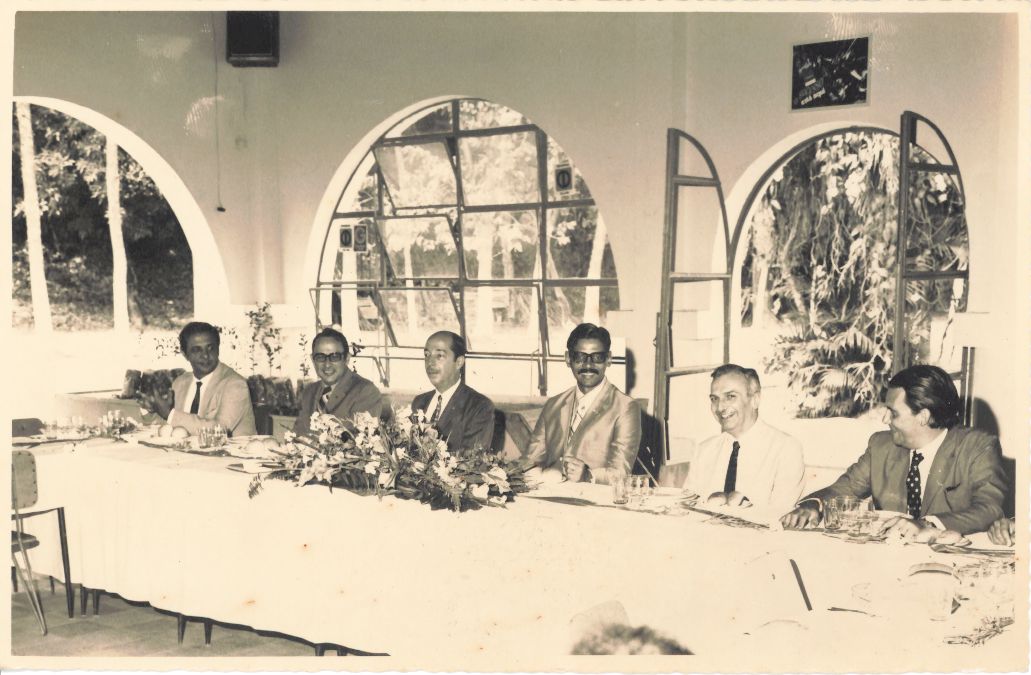 Abstract: | Retrata o almoço de confraternização promovido pela UFRPE no restaurante do Horto Zoobotânico de Dois Irmãos relacionado a uma comemoração não identificada. Nesse outro ângulo, pode-se observar a mesa ornamentada na qual encontram-se 06 autoridades, entre elas o professor Adierson Erasmo de Azevedo, reitor da UFRPE, tendo ao seu lado direito o professor Eudes de Souza Leão Pinto, ambos ladeados por 04 autoridades não identificadas. Olhando-se de forma ampla, observa-se 02 janelões e 01 porta que se abrem para um pátio arborizado. Durante a entrevista para rememoração, ao observar a fotografia, o reitor Adierson falou: “Vejo ao meu lado o ilustre professor Eudes de Souza Leão Pinto... Quem mais?... não dá para lembrar quem são. (Observando...) Esse restaurante do Horto era um prédio com uma arquitetura moderna com janelões”. FONTES DE PESQUISA: Entrevista concedida às bibliotecárias Conceição Martins e Vania Ferreira para atender aos objetivos do Repositório Institucional, projeto “(Re) Memórias da UFRPE”, para a contextualização das imagens do acervo fotográfico do reitorado do Prof. Dr. Adierson Erasmo de Azevedo, no período de dezembro de 1969 a agosto de 1973. Acervo localizado no Núcleo do Conhecimento Professor João Baptista Oliveira dos Santos, da Biblioteca Central da UFRPE. Entrevista realizada no dia 04 de maio de 2016, no setor de Normalização da Biblioteca Central da UFRPE. Duração de 2h32min22seg, com transcrição e pesquisa complementar da bibliotecária Conceição Martins. |