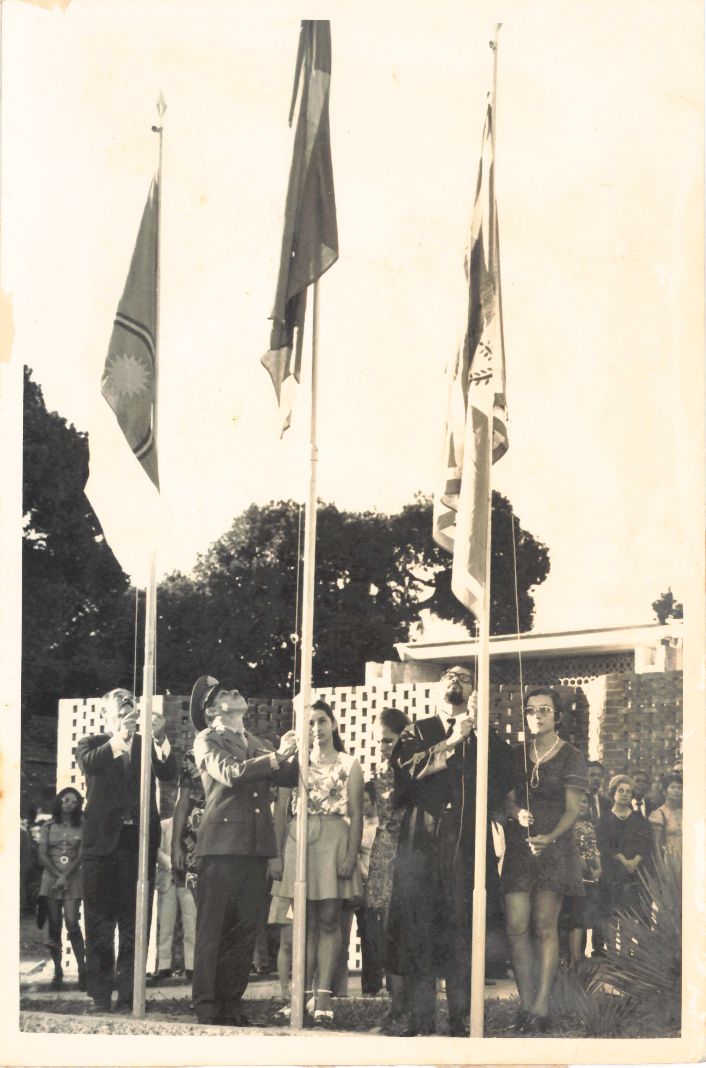 | Abstract: | Registra o hasteamento do Brasil, de Pernambuco e outra não identificada, em local também não identificado. Nesta fotografia, vê-se um grupo pessoas, acompanhando o hasteamento diante de um prédio em local não identificado. Durante a entrevista para rememoração, ao observar a fotografia, o reitor Adierson falou: “Observando... Não lembro que prédio é esse e nem onde fica... Você me desculpem, minha memória hoje não está colaborando”. FONTES DE PESQUISA: Entrevista concedida às bibliotecárias Conceição Martins e Vania Ferreira para atender aos objetivos do Repositório Institucional, projeto “(Re) Memórias da UFRPE”, para a contextualização das imagens do acervo fotográfico do reitorado do Prof. Dr. Adierson Erasmo de Azevedo, no período de dezembro de 1969 a agosto de 1973. Acervo localizado no Núcleo do Conhecimento Professor João Baptista Oliveira dos Santos , da Biblioteca Central da UFRPE. Entrevista realizada no dia 29 de abril de 2016, no Espaço Santander da Biblioteca Central da UFRPE. Duração de 2h24min com transcrição da bibliotecária Conceição Martins. |