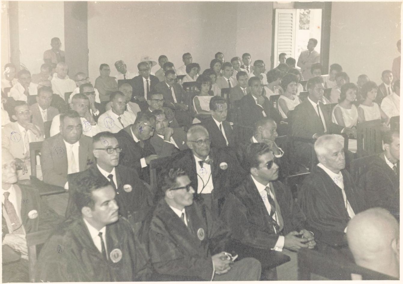 Abstract: Registra a comunidade da Universidade reunida durante a celebração do Cinquentenário da Escola Superior de Agricultura da Universidade Rural de Pernambuco-URP, atual UFRPE, realizada no Mosteiro de São Bento, Olinda, Pernambuco. Observa-se parte do público participante formado por docentes, monges, servidores e estudantes, com destaque para os seguintes docentes da ESA: Antônio Gondim Lóssio, José Edson, Dom Gabriel Beltrão O.S.B., Edvaldo Saldanha, Ivan Tavares, João de Deus de Oliveira Filho, Jair Meireles, Newton Banks da Rocha, Artur Lopes, Espedito Meira Couceiro, Willen Koller, Fernando Geraldo Monteiro Ferreira, Hermano de Casto, Clóvis Coelho de Andrade, Paulo Barreto Campelo e Emanuel Barreto Campelo. Todos os docentes trajam beca, usada pelos membros do Conselho Universitário, que constitui a veste talar ou traje oficial próprio da vestimenta do Cerimonial Universitário. Os demais participantes não foram identificados. FONTES DE PESQUISA: GOMES, Simone. Cerimonial da UFRPE. Depoimento oral concedido à bibliotecária Conceição Martins em 15 de setembro de 2023; UNIVERSIDADE RURAL DE PERNAMBUCO. Plaquete comemorativa do cinquentenário da Escola Superior de Agricultura da Universidade Rural de Pernambuco: 1912-1962. Recife: Imprensa Universitária URP, 1962. PESQUISA COMPLEMENTAR: ARANTES, Antonio Augusto (Org). Produzindo passado: estratégias de construção do patrimônio cultural. São Paulo: Brasiliense, 1984; KOSSOY, Bóris. A fotografia como fonte histórica: introdução à fotografia e interpretação das imagens do passado. São Paulo: Museu da Indústria, Comércio e Tecnologia, 1980.