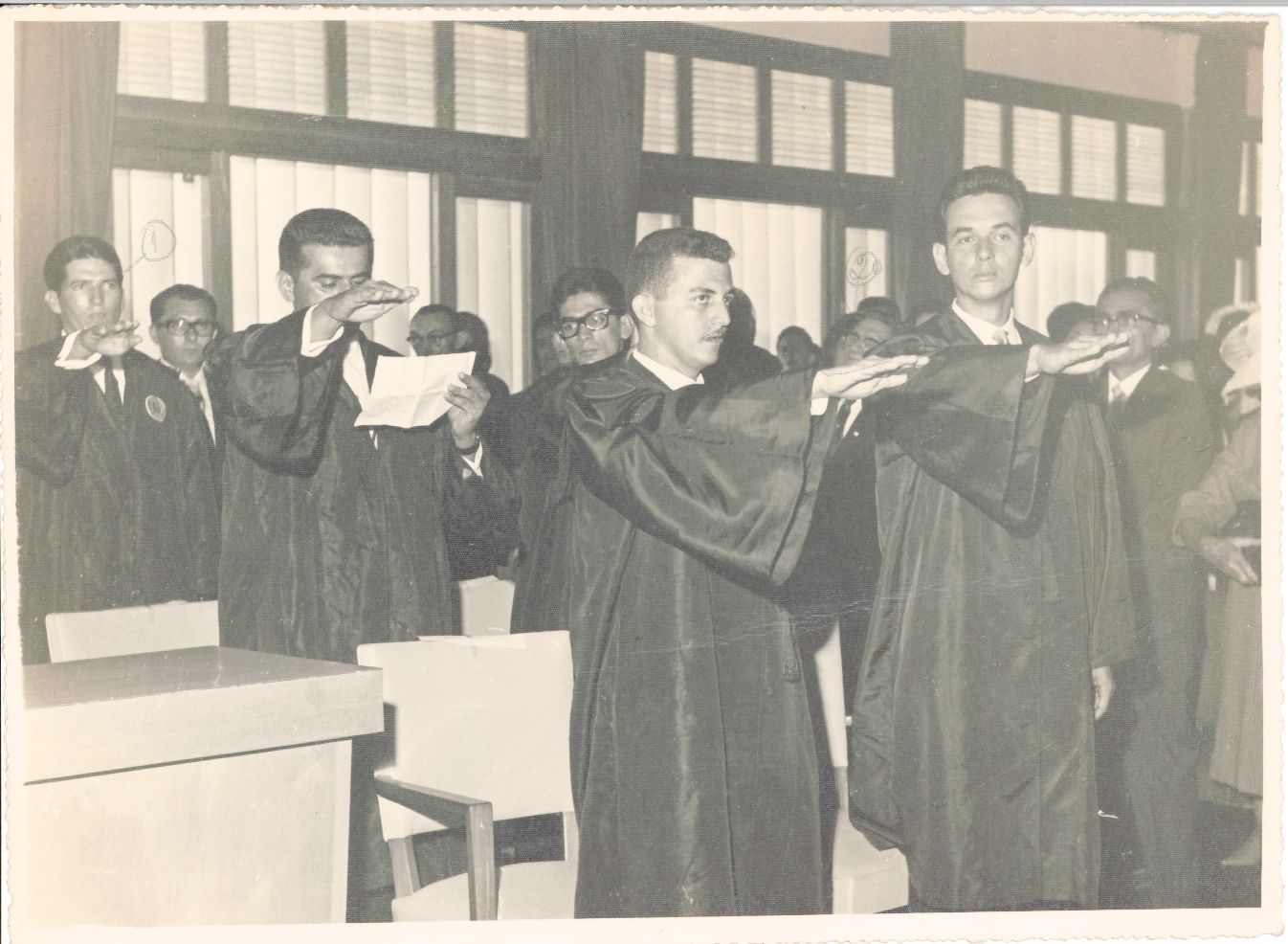 | Abstract: | Flash da solenidade de formatura da turma de Médicos Veterinários de 1962, vendo-se os formandos posicionados ao lado esquerdo da bancada utilizada pelos conselheiros dos Conselhos Superiores da UFRPE, trajando a beca, veste talar própria da vestimenta do Cerimonial Universitário, nas solenidades oficiais. Evento realizado no salão nobre, vendo-se o momento em que os formandos fazem o juramento com o braço direito erguido pronunciando o texto do mesmo que forma esse ritual de passagem. Pode-se observar na lateral esquerda da fotografia, entre os formandos, José Edvaldo Meira Couceiro e entre os convidados, seu genitor, Carlos José Couceiro, na primeira fila do auditório do mencionado salão nobre, no ângulo lateral esquerdo da fotografia. É possível perceber no ângulo superior da fotografia, as portas laterais que dão acesso ao corredor externo ao salão. |