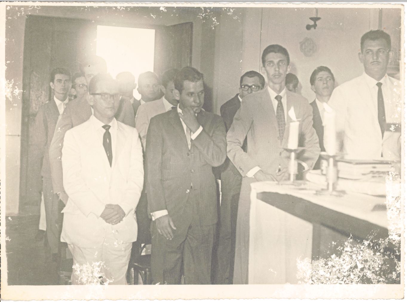 | Citação: | UNIVERSIDADE FEDERAL RURAL DE PERNAMBUCO. Missa em Ação de Graças da formatura dos engenheiros agrônomos e médicos veterinários de 1962, no Mosteiro de São Bento, Olinda, PE. Fotografia original em preto e branco, revelada em papel fosco, em sépia, medindo 23 cm x 18 cm, no formato horizontal. |