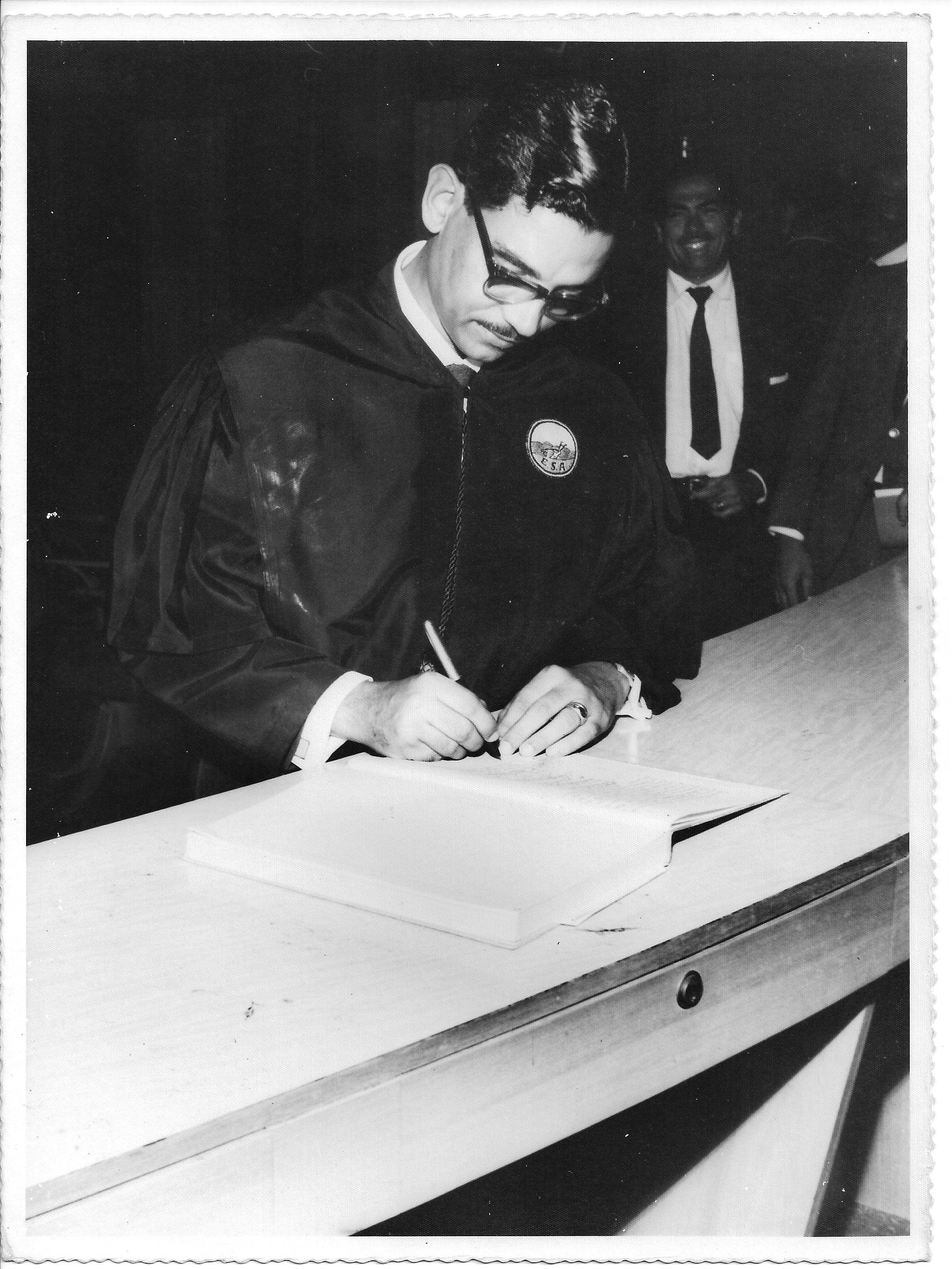 | Abstract: | Registra o Professor Adierson Erasmo de Azevedo durante a assinatura no Livro de Atas do Conselho Universitário momentos antes da solenidade de sua posse como Reitor da UFRPE no Salão Nobre da UFRPE, às 10h do dia 13 de novembro de 1963. De pé, veste a beca, veste talar ou traje oficial próprio da vestimenta do Conselho Universitário, usado pelos conselheiros nas solenidades oficiais. Vendo-se ao fundo, o Professor Espedito Meira Couceiro demonstrando sua satisfação num largo sorriso. FONTES DE PESQUISA: Entrevista concedida às bibliotecárias Conceição Martins e Vania Ferreira para atender aos objetivos do Repositório Institucional, projeto “(Re) Memórias da UFRPE”, para a contextualização das imagens do acervo fotográfico do reitorado do Prof. Dr. Adierson Erasmo de Azevedo, no período de dezembro de 1969 a agosto de 1973, localizado no Núcleo do Conhecimento e da Memória Agronômica “Professor João Baptista Oliveira dos Santos”, da Biblioteca Central da UFRPE. Entrevista realizada no dia 13 de abril de 2016, no Espaço Santander da Biblioteca Central da UFRPE. Duração de 2h40min com transcrição e pesquisa complementar da bibliotecária Conceição Martins; Plaquete Mérito Agronômico 2004. Recife: APCA, 2004. 98 p.; AZEVEDO, Adierson Erasmo de. A “caminhada seguindo o sol” da Universidade Federal Rural de Pernambuco. Recife: EDUFERPE, 2007. 147 p. GOMES, Simone. Cerimonial da UFRPE. Depoimento oral concedido à bibliotecária Conceição Martins em 20 de abril de 2016. |